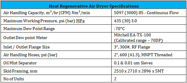 OCS owned Air Drying spread is used in the pipeline pre commissioning operation spread for the drying operation. The drying of pipeline only applies for gas pipelines, to avoid formation of hydrate or corrosion. There are various methodologies for drying pipelines such as methanol, air drying vacuum and nitrogen. The most commonly used is dry air. The advantages of super dry air process are; low dew point, corrosion protection and economical, safe, non-hazardous cleaning action. The pipeline will be dried by the introduction of oil free and -70°C of super dry air.