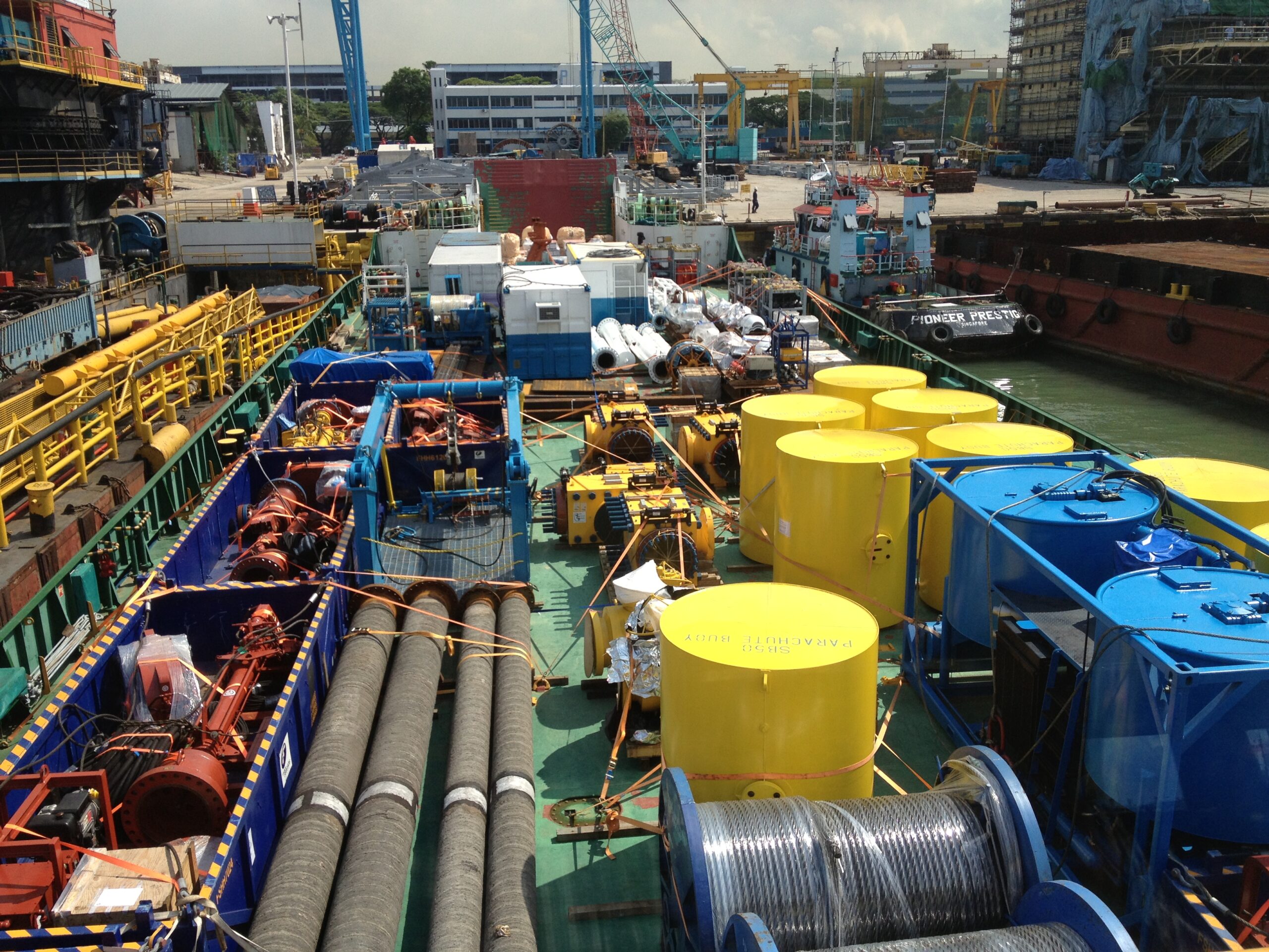 • Mobilization & Rig-up of “Main Installation Vessel” such as Derrick Lay Barge/Vessel, Crane Barge, Diving Support Vessel. This involves the complex coordination onboard with various key subcontractors e.g. Survey & Positioning, ROV, Diving, Piling Equipment, Reel Laying Equipment, Pre-Commissioning etc.