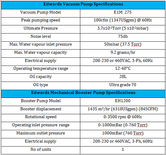 OCS owned Edwards E1M 275 vacuum pump is a direct drive rotary vane pump which compact in design and vibration free unit is used for vacuum drying scope. The ultimate pressure of this pump is 3.7×10-2 Torr and a pumping speed of 180CFM. This pump provides excellent operator protection by providing finger proof coupling housing and totally enclosed fan-cooled motors.