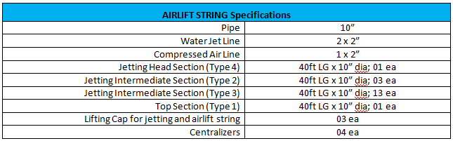 OCS owned Airlift consists of flanged strings of 10” Pipe fitted with 2 x 2” Water Jet lines and 1 x