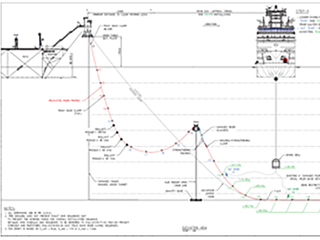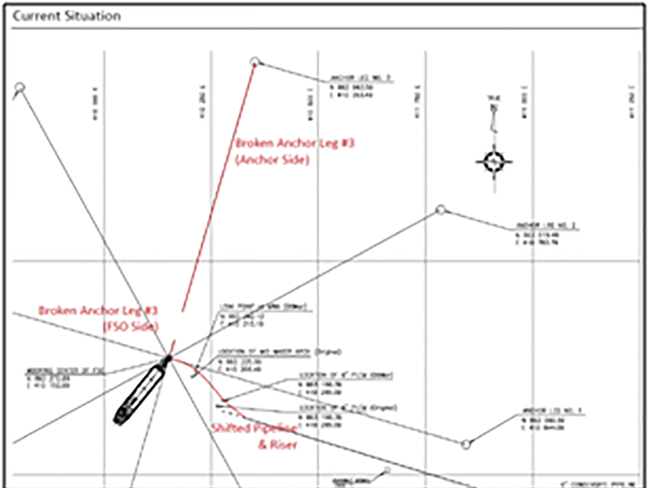 The MV12 FSO is located in Rong Doi Field, offshore Vietnam, approximately 170nm (320km) southeast of Vung Tau, in a water depth of approximately 85 meters. It was designed with an external turret mooring system which consists of eight (8) symmetrical anchor legs and with a thirty (30) year service life beginning Nov 2006. It is connected to a WHP, approximately 3km via a 6” flexible riser (supported by a Mid Water Arch) to a Pipe Line End Manifold (PLEM) and to a 6” rigid pipeline to transfer condensate to the FSO.