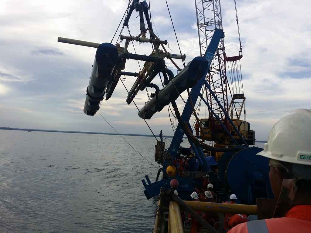 - HESS Indonesia (Ujung Pangkah Phase 1) 2010, 6″ CWC, 12″ CWC & 16″ CWC pipelines x 5.5 km burial distance each line, 2.0m TOP cover.Nearshore north of Gresik/Surabaya, East Java, Indonesia(2009)