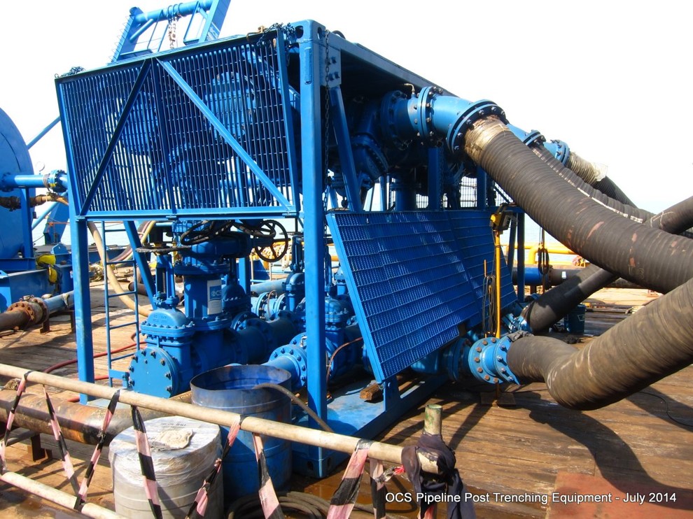 The key to effective pipeline post trenching is the supply of high volumes of properly directed pressurised water. OCS has invested heavily in large pumping skids for this purpose. As noted above all pumps are contained in heavy duty structural skids. OCS has a total of seven (7) high volume / high pressure pumps skids in inventory. Four units are equipped with high spec solid stainless steel 5 stage centrifugal fluid ends while 3 are 4 stage centrifugal units with a lower pressure rating. The 5 stage pumps have a multiplier gear box between the power train and the fluid end to increase pump shaft revolutions.