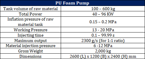 This foam pump has the technical characteristics such as high pressure collision stirring, dedicated insulation pipes for foaming, hybrid adjustable range, automatic feeding, self-cleaning mixing head etc. This pump integrated with control panel for fully controlling in pump function for chemical filling, mixing and injection during fabrication.