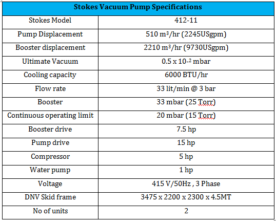 The Vacuum pump employed in the OCS’s pipeline pre commissioning operation spread is a Stokes model 412-11 Micro Vac Pump with stokes 615M series blower.