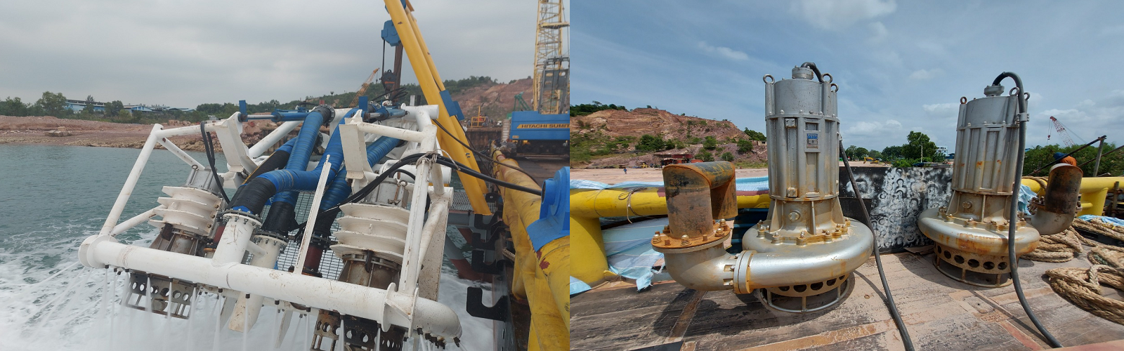 OCS owned Toyo DP-100B-1 pumps are extra heavy duty submersible slurry pumps which are specialized for our dredging projects. Basically, it is a pump and an excavator at the same time. The design incorporates the renowned patented Toyo agitator, attached directly on the pump shaft, closed impeller, large open passages for easy passage of solids, heavy duty shaft and bearing configuration, special seals working in an oil bath and 8 pole customs built electric motor with 1.35 service factor. The impeller, the wear plates and the agitator are manufactured in cast chrome iron (24 to 28%) with Two adjustable wear plates which allows optimizing hydraulic efficiency of the pump.