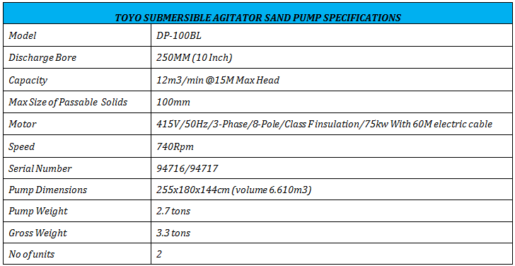 OCS owned Toyo DP-100B-1 pumps are extra heavy duty submersible slurry pumps which are specialized for our dredging projects. Basically, it is a pump and an excavator at the same time. The design incorporates the renowned patented Toyo agitator, attached directly on the pump shaft, closed impeller, large open passages for easy passage of solids, heavy duty shaft and bearing configuration, special seals working in an oil bath and 8 pole customs built electric motor with 1.35 service factor. The impeller, the wear plates and the agitator are manufactured in cast chrome iron (24 to 28%) with Two adjustable wear plates which allows optimizing hydraulic efficiency of the pump.