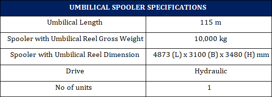 The reel on this spooler has been designed for high pressure umbilical that need appropriate diameter of center shaft to keep the umbilical spooled around the reel while the operation require high pressure to run the system.