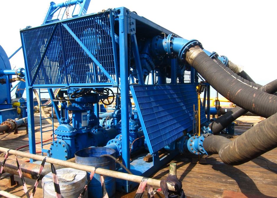 - Diesel Driven (GM 12V149) 4 stage Centrifugal pumps (Skid Mounted) delivering 2000 US gallons per minute at 350 psi. – 3 units. 4-stage pump is suitable for the operation required water jetting, which can be utilized also for FCG project.