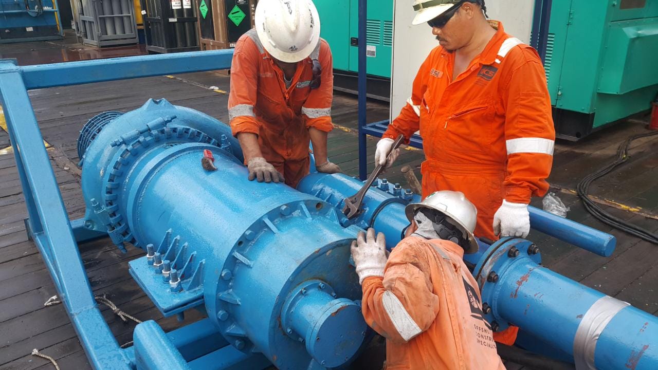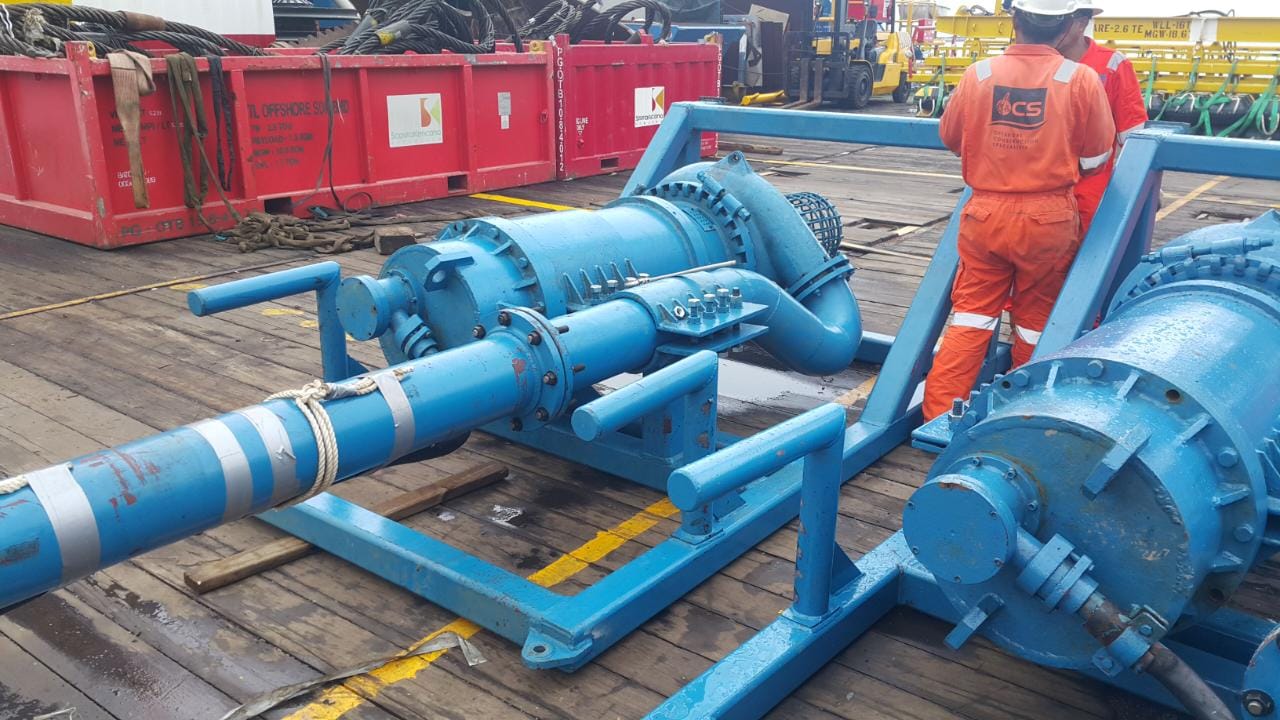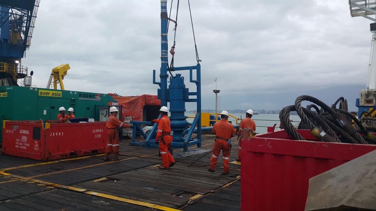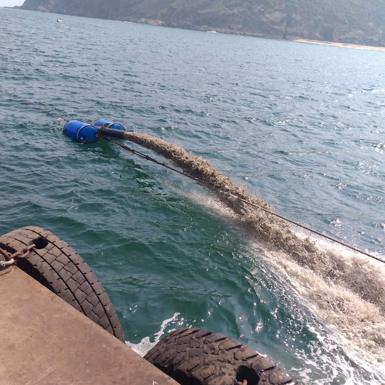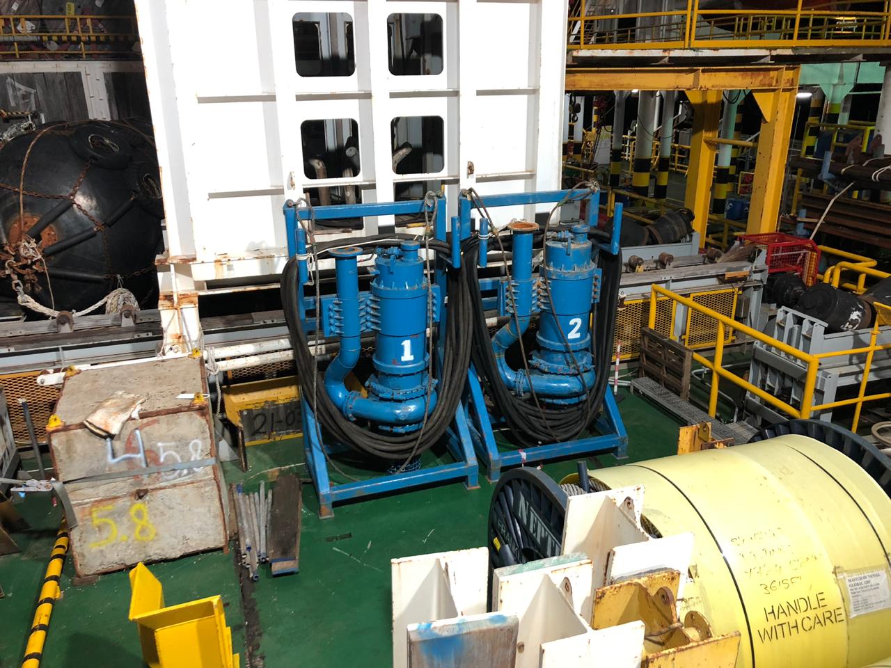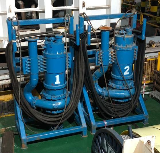 The submersible sand pump is being used for underwater trenching/dredging job where the pump will suck mixture of water and sand into the pump and discharge it through the discharge line